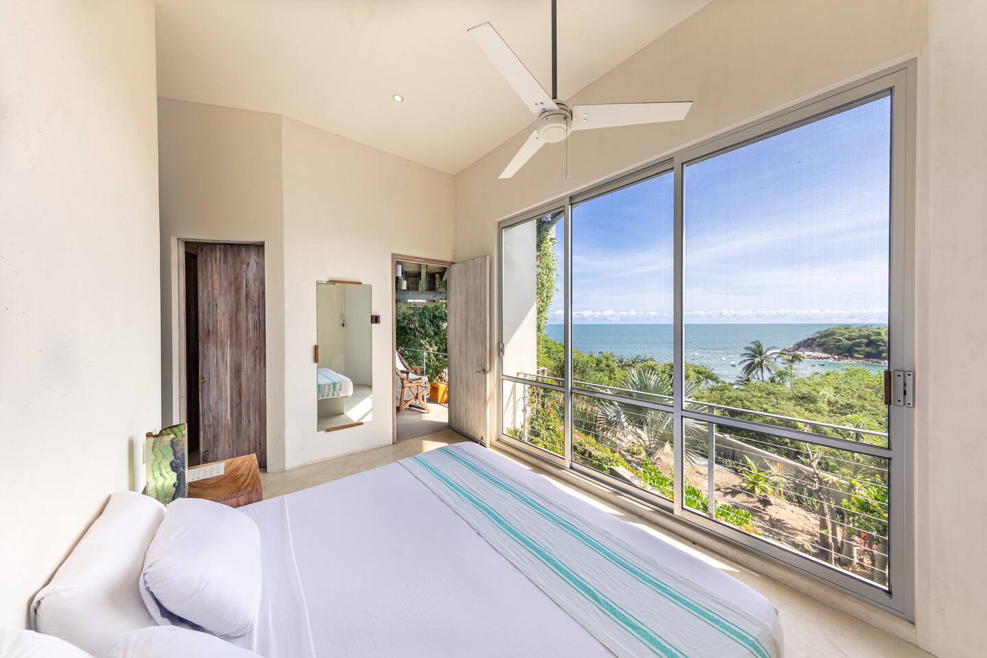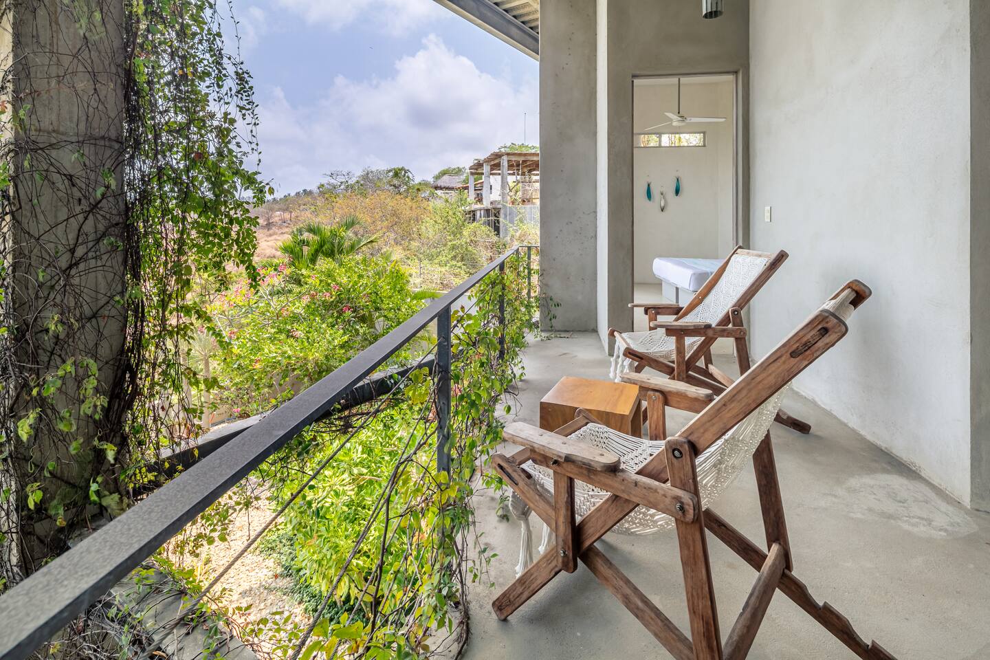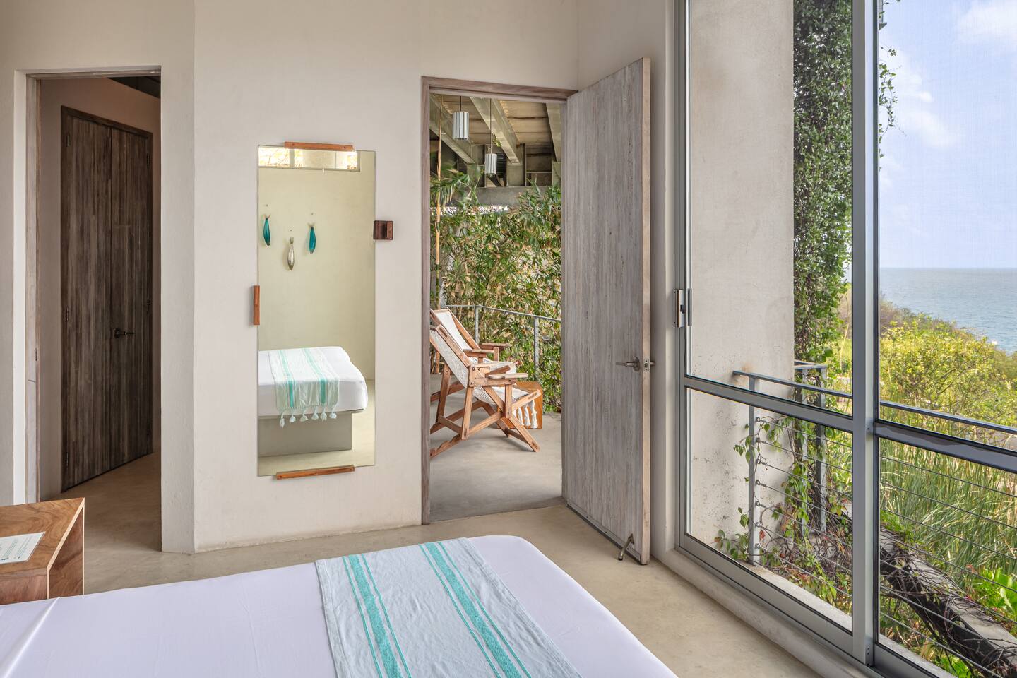 Room #2 is the most spacious room at Casa Cascada, offering elevated comfort and panoramic views of the Pacific Ocean. Located on the second level, this bright and airy room features a large private patio where you can relax in hammock chairs, a cushioned lounger, or enjoy meals at the outdoor table—all while taking in the sweeping ocean scenery. Inside, you’ll find a flexible bed setup with either a plush king-size bed or two twin beds, depending on your preference. The ensuite bathroom includes double vanities and a large double rain shower with a built-in bench—ideal for unwinding after a beach day. Whether you're lounging on the patio or gazing out at the sea from your bed, Room #2 provides a beautiful balance of comfort, style, and natural connection. A digital safe is included for your peace of mind. Note: Casa Cascada is naturally ventilated and does not include air conditioning or glass windows. The open design welcomes ocean breezes to cool the space. This room may not suit guests who require traditional climate control or complete enclosure. Please also note: Our multi-level property is built into a hillside and features outdoor staircases, uneven stone paths, and open walkways. These architectural elements may not suit those requiring mobility support or childproofed surroundings. Shared spaces available to all guests include: • A fully equipped kitchen • Spacious dining and living area • Infinity pool with panoramic views • Dedicated remote working space Geographic Setting: Casa Cascada is located just above Playa Manzanillo—one of Puerto Escondido’s most swimmable and scenic beaches. The property is a 5-minute drive from Puerto Escondido Airport, 7 minutes from Zicatela Beach, and 12 minutes from La Punta. The area is peaceful and safe, ideal for a relaxing coastal experience. Free street parking with camera surveillance is available nearby. Nearby Amenities: Guests have easy access to surf beaches, yoga studios, artisanal markets, cafés, and restaurants. Local taxis are widely available, and airport transfers can be arranged upon request. For those who enjoy nature, nearby jungle trails and secluded beaches provide the perfect escape. Key Features Tranquil natural setting 🙌 Open-air eco design with fans 🌬️ Infinity pool with panoramic ocean views 🌅 Private ocean-view patio with lounge seating 🌿 Daily homemade breakfast included 🍳 King-size or twin bed setup + ensuite bathroom 🛏️ Fully equipped shared kitchen access 🍽️ High-speed WiFi & co-working space 💻 Digital safe & privacy shutters 🔐 On-site staff & English-speaking host 🤝 Transportation: Free street parking is available nearby. Taxis and airport transfers can be arranged, and you’ll be just 15 minutes from downtown Puerto Escondido and close to several beach towns and surf spots.