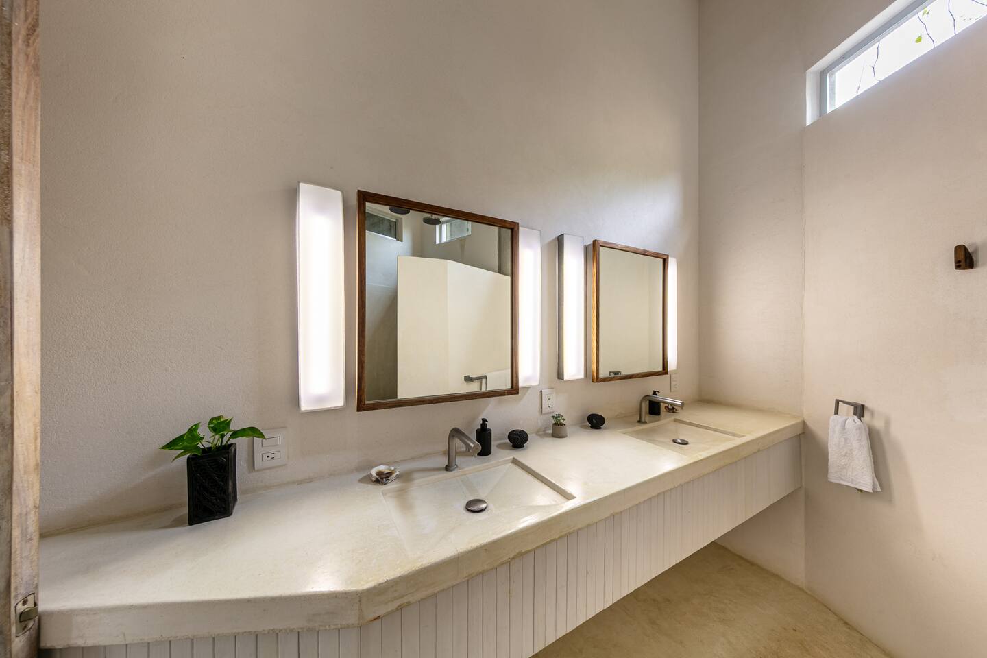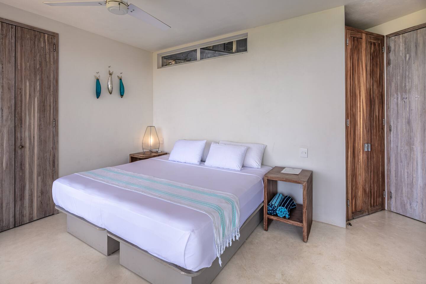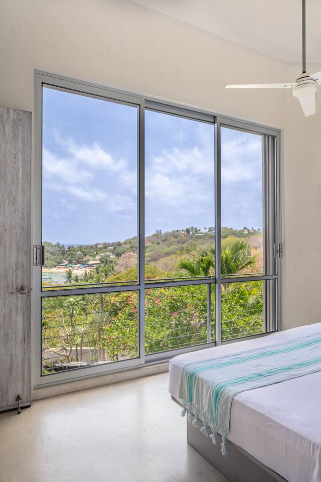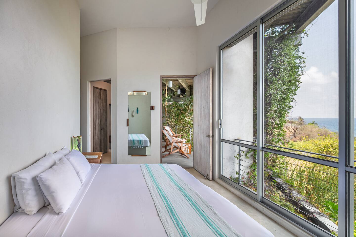Room #2 is the most spacious room at Casa Cascada, offering elevated comfort and panoramic views of the Pacific Ocean. Located on the second level, this bright and airy room features a large private patio where you can relax in hammock chairs, a cushioned lounger, or enjoy meals at the outdoor table—all while taking in the sweeping ocean scenery. Inside, you’ll find a flexible bed setup with either a plush king-size bed or two twin beds, depending on your preference. The ensuite bathroom includes double vanities and a large double rain shower with a built-in bench—ideal for unwinding after a beach day. Whether you're lounging on the patio or gazing out at the sea from your bed, Room #2 provides a beautiful balance of comfort, style, and natural connection. A digital safe is included for your peace of mind. Note: Casa Cascada is naturally ventilated and does not include air conditioning or glass windows. The open design welcomes ocean breezes to cool the space. This room may not suit guests who require traditional climate control or complete enclosure. Please also note: Our multi-level property is built into a hillside and features outdoor staircases, uneven stone paths, and open walkways. These architectural elements may not suit those requiring mobility support or childproofed surroundings. Shared spaces available to all guests include: • A fully equipped kitchen • Spacious dining and living area • Infinity pool with panoramic views • Dedicated remote working space Geographic Setting: Casa Cascada is located just above Playa Manzanillo—one of Puerto Escondido’s most swimmable and scenic beaches. The property is a 5-minute drive from Puerto Escondido Airport, 7 minutes from Zicatela Beach, and 12 minutes from La Punta. The area is peaceful and safe, ideal for a relaxing coastal experience. Free street parking with camera surveillance is available nearby. Nearby Amenities: Guests have easy access to surf beaches, yoga studios, artisanal markets, cafés, and restaurants. Local taxis are widely available, and airport transfers can be arranged upon request. For those who enjoy nature, nearby jungle trails and secluded beaches provide the perfect escape. Key Features Tranquil natural setting 🙌 Open-air eco design with fans 🌬️ Infinity pool with panoramic ocean views 🌅 Private ocean-view patio with lounge seating 🌿 Daily homemade breakfast included 🍳 King-size or twin bed setup + ensuite bathroom 🛏️ Fully equipped shared kitchen access 🍽️ High-speed WiFi & co-working space 💻 Digital safe & privacy shutters 🔐 On-site staff & English-speaking host 🤝 Transportation: Free street parking is available nearby. Taxis and airport transfers can be arranged, and you’ll be just 15 minutes from downtown Puerto Escondido and close to several beach towns and surf spots.