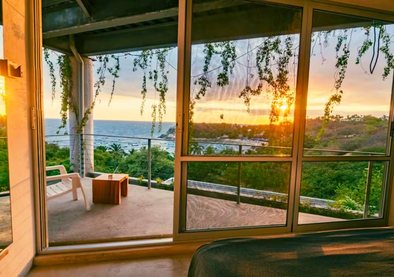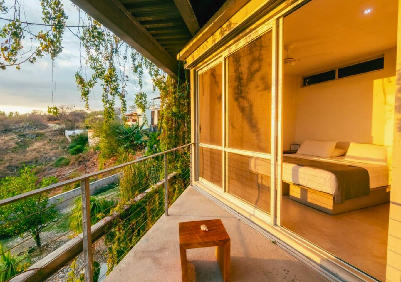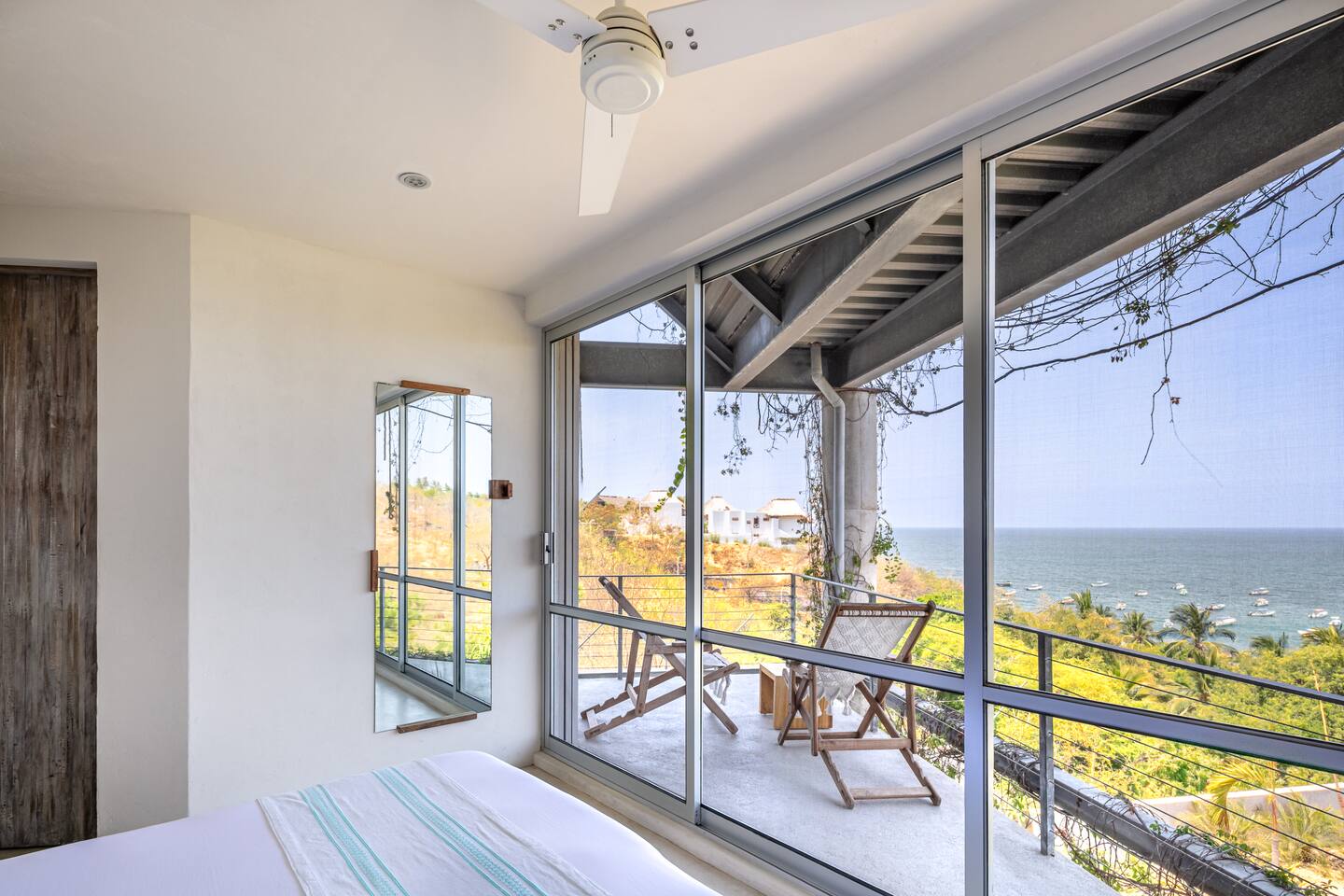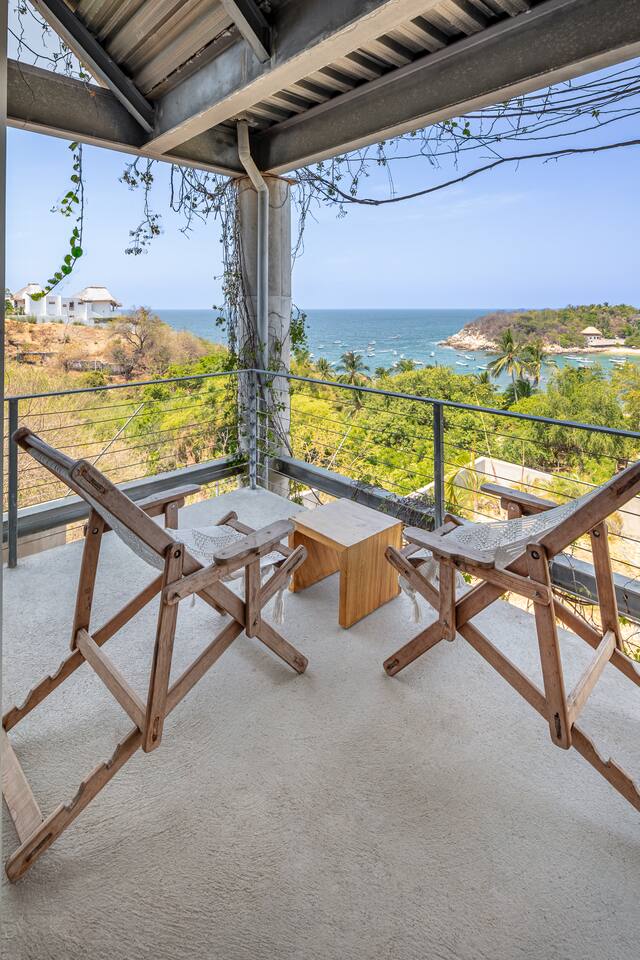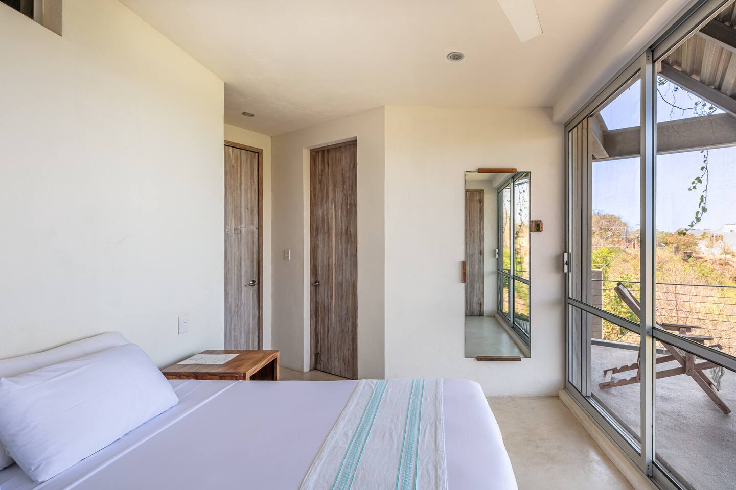 Located on the second level of Casa Cascada, Room #6 offers expansive ocean views and a relaxed coastal ambiance. Wake up to the Pacific right from your bed, then step onto your private patio, complete with a hammock, two chairs, and a table—perfect for enjoying the sea breeze or a quiet morning coffee. Inside, the room includes a flexible bed setup (king-size or two twins upon request), an ensuite bathroom, and a spacious surfboard closet for travelers bringing their gear. The space blends tropical warmth with clean, industrial design, creating a comfortable and airy environment ideal for rest and inspiration. A digital safe is also included for your peace of mind Note: Casa Cascada is naturally ventilated and does not include air conditioning or glass windows. The open design welcomes ocean breezes to cool the space. This room may not suit guests who require traditional climate control or complete enclosure. Please also note: Our multi-level property is built into a hillside and features outdoor staircases, uneven stone paths, and open walkways. These architectural elements may not suit those requiring mobility support or childproofed surroundings. Shared spaces available to all guests include: • A fully equipped kitchen • Spacious dining and living area • Infinity pool with panoramic views • Dedicated remote working space Geographic Setting Casa Cascada is located right on Playa Manzanillo, one of Puerto Escondido’s most beautiful and swimmable beaches. Just 5 minutes from Puerto Escondido Airport, 7 minutes by car to Zicatela Beach, and 12 minutes to La Punta—the heart of surf and nightlife. The area is peaceful and safe, ideal for a relaxing escape. There is ample street parking with camera surveillance for extra security. Nearby Amenities Guests can easily access surf beaches, beachside bars, yoga studios, artisanal markets, and a variety of restaurants and cafés. Taxis are readily available, and transportation to/from Puerto Escondido Airport can be arranged upon request. The nearby jungle trails and unspoiled beaches offer a deeper connection with nature Key Features - Adults-only for tranquil ambiance 🙌 - No A/C – open-air eco design with fans 🌬️ - Infinity pool with panoramic ocean views 🌅 - Garden-view terrace with ocean glimpses 🌿 - Homemade breakfast included 🍳 - King-size bed and private bathroom 🛏️ - Access to fully equipped shared kitchen 🍽️ - High Speed WiFi & dedicated co-working space 💻 - Digital safe & privacy screens 🔐 - Full-time staff & English-speaking host available 🤝 Transportation Taxis and airport transfers available, Free street parking nearby, 15 minutes to downtown Puerto Escondido, Easy access to surf spots and beach towns
