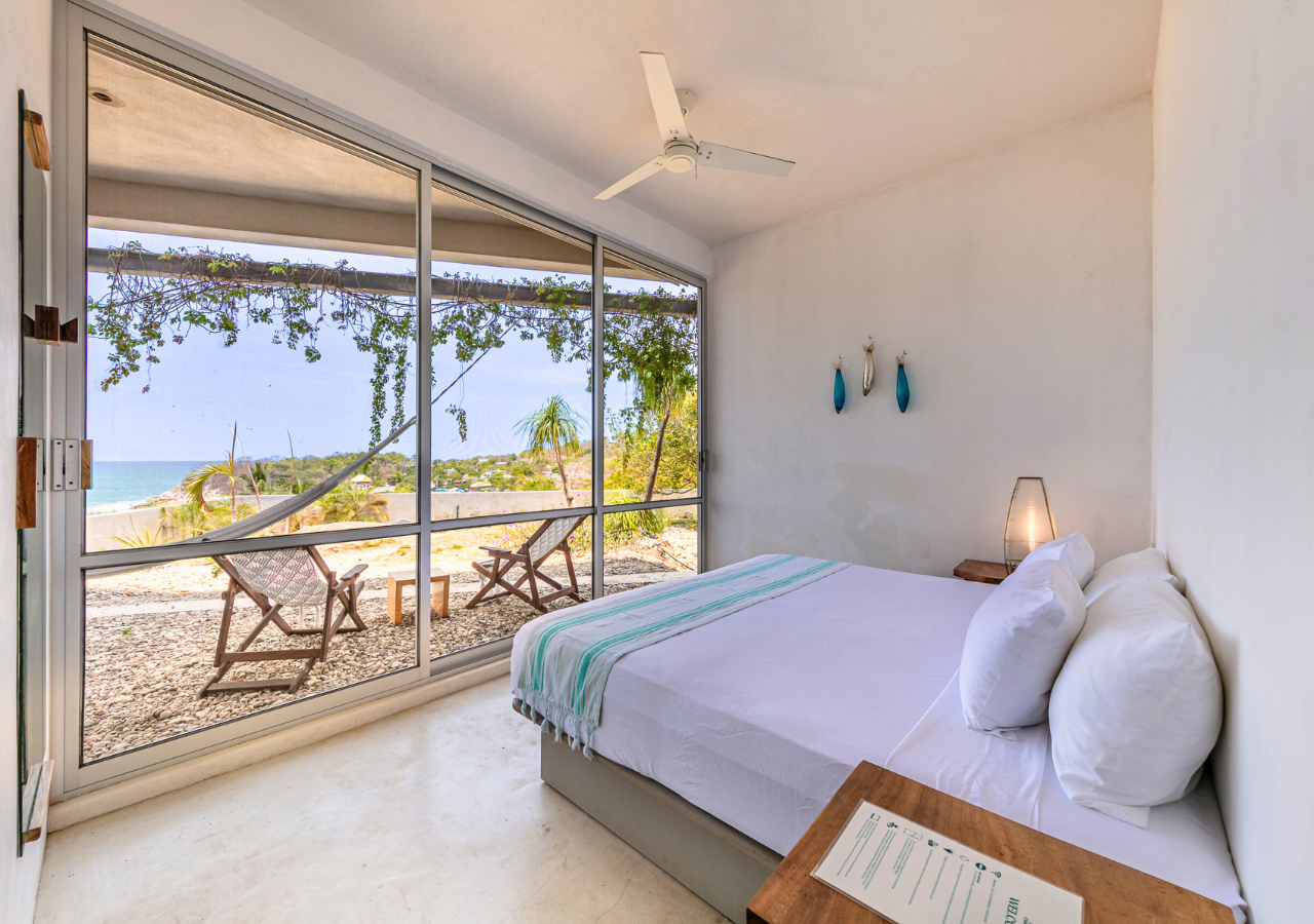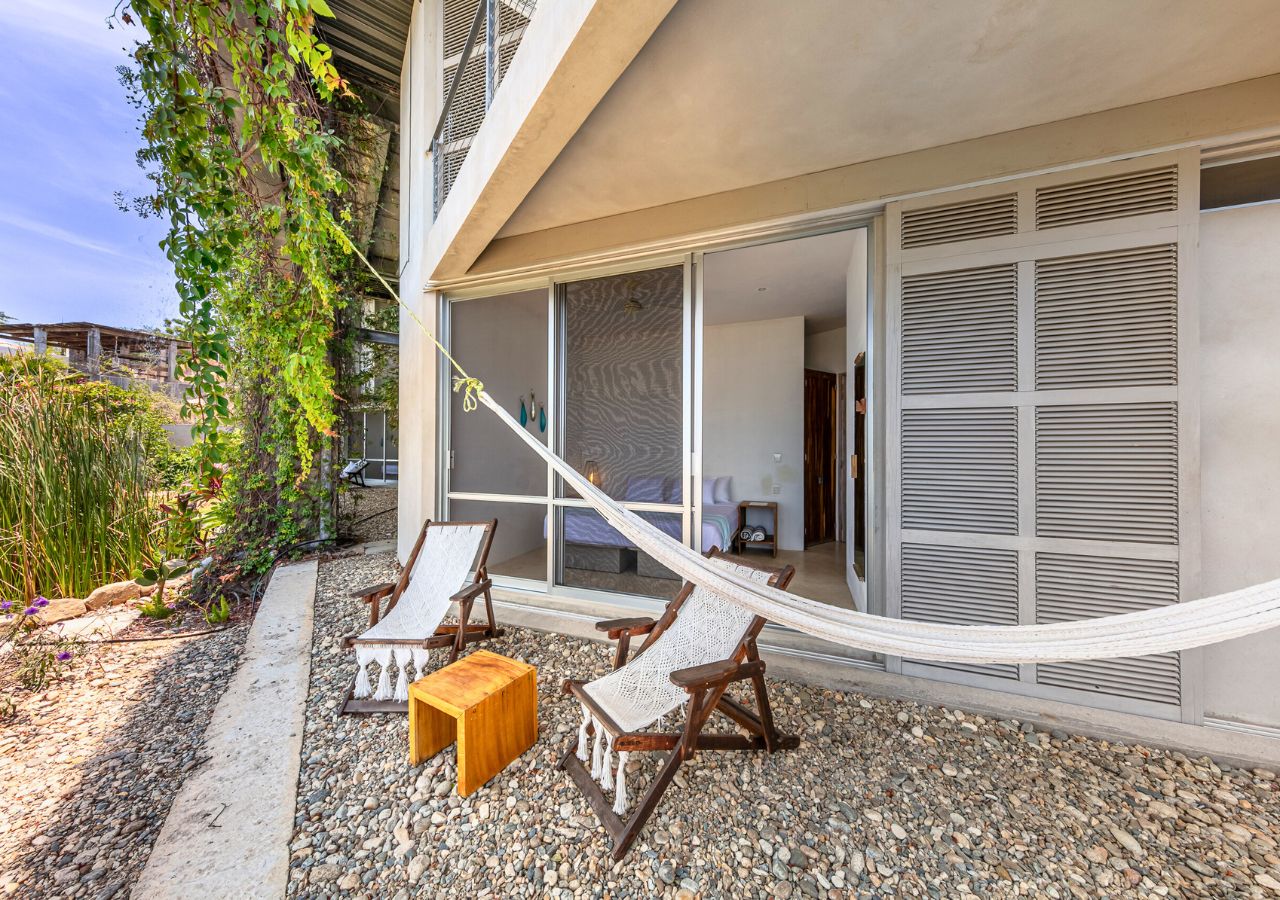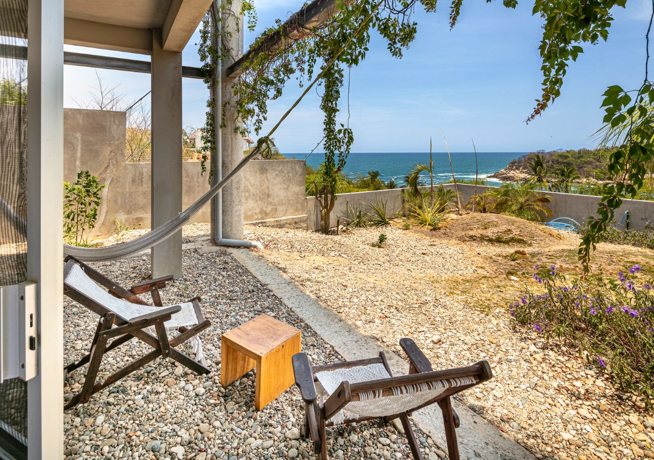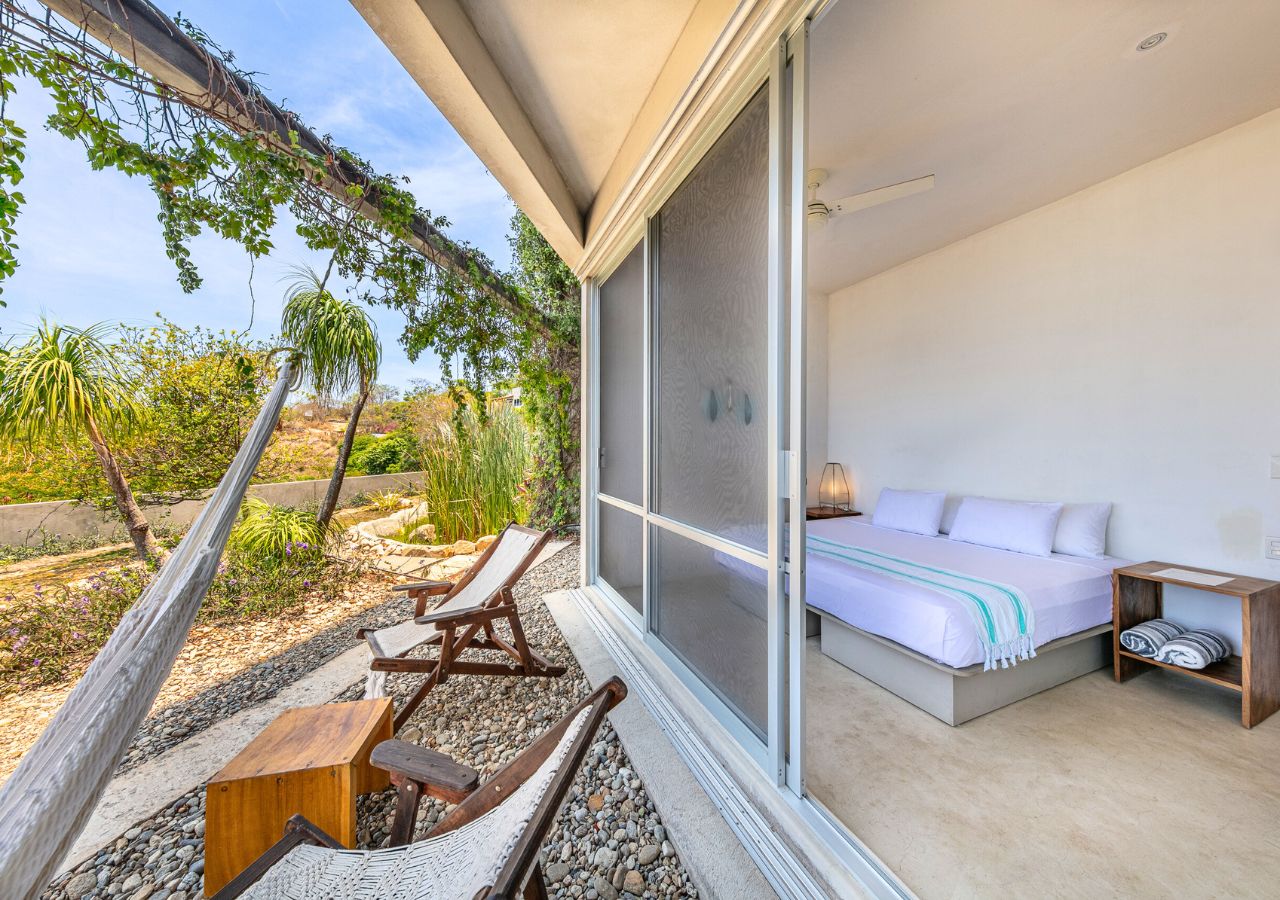 Room #7 is a cozy and comfortable garden-level bedroom designed with natural textures and modern industrial flair. Guests can choose between a king-size bed or two twin beds, making it ideal for solo travelers, friends, or couples. Step outside to your private garden patio, where hammock chairs and a table create a peaceful space for enjoying the morning breeze or a quiet sunset moment. The room includes an ensuite bathroom and a digital safe for your personal belongings. Casa Cascada is naturally ventilated and does not have air conditioning or traditional glass windows. The open-air architecture allows ocean breezes to flow through rooms and shared spaces. Please note: Casa Cascada is built into a hillside and spans multiple levels connected by outdoor stairs and elevated walkways. There are no elevators, and some areas include open ledges, stone paths, and uneven surfaces. These features may be important to consider for guests traveling with young children or individuals with mobility limitations. Shared spaces available to all guests include: • Fully equipped kitchen • Spacious dining and living areas • Infinity pool with panoramic ocean views • Dedicated remote working space Geographic Setting: Casa Cascada is located just above Playa Manzanillo—one of Puerto Escondido’s most scenic and swimmable beaches. The home is a 5-minute drive from Puerto Escondido Airport, 7 minutes to Zicatela Beach, and 12 minutes to La Punta. The neighborhood is calm and safe, perfect for a coastal experience. Free street parking with camera surveillance is available nearby. Nearby Amenities: Guests have easy access to surf beaches, yoga studios, markets, cafés, and local restaurants. Taxis are widely available, and airport transfers can be arranged upon request. Nearby jungle trails and untouched beaches offer a deeper connection to nature. Key Features: Garden-level room with private patio 🌿 Open-air eco design with fans 🌬️ Infinity pool with ocean panorama 🌅 Flexible bed setup: king or twin beds 🛏️ High-speed Wi-Fi & remote work area 💻 Secure digital safe 🔐 Daily homemade breakfast included 🍳 Friendly staff & multilingual host 🤝 Kitchen and common areas shared with other guests 🍽️ Transportation: Free street parking is nearby. Taxis and airport transfers can be arranged. The home is 15 minutes from downtown Puerto Escondido and close to local surf and beach destinations.