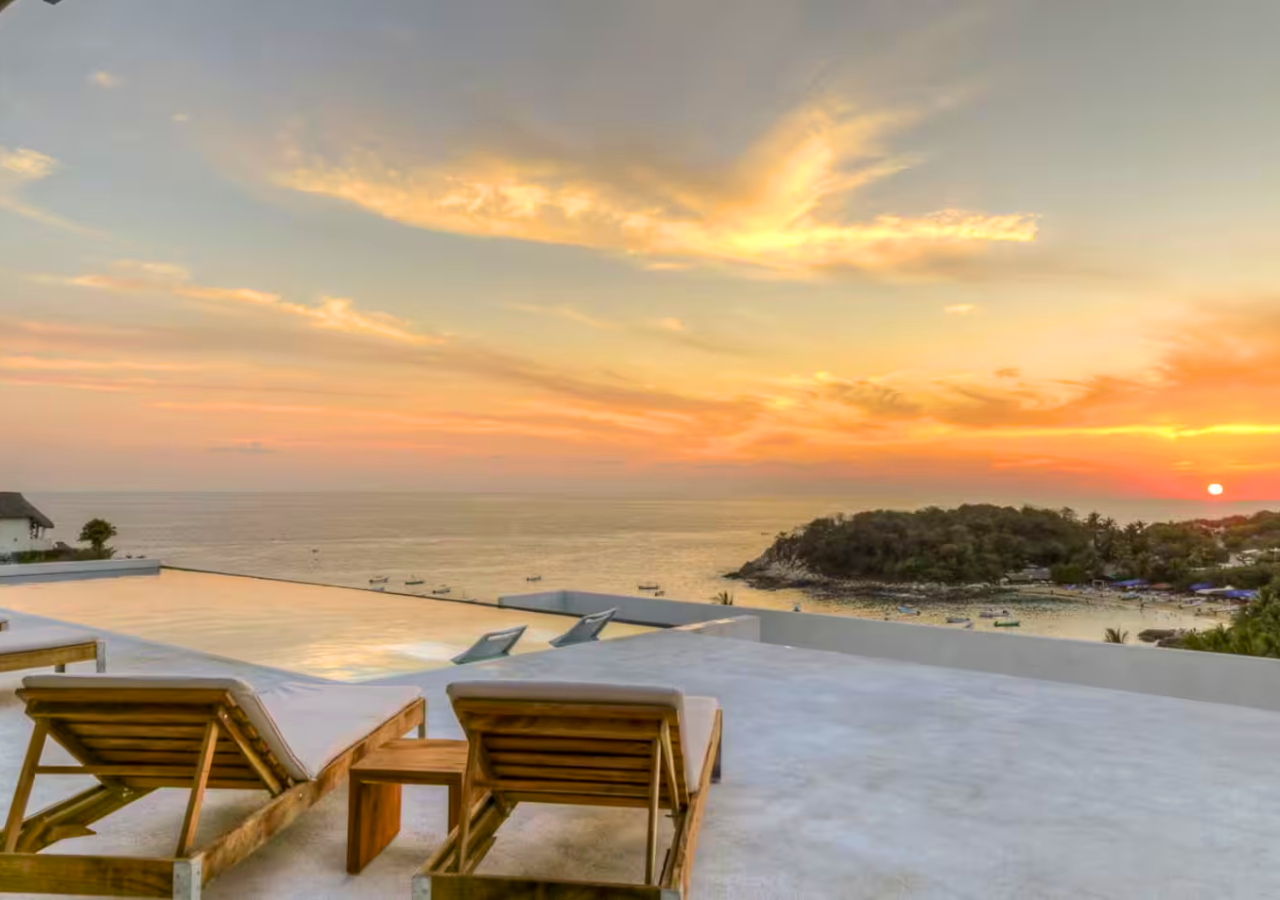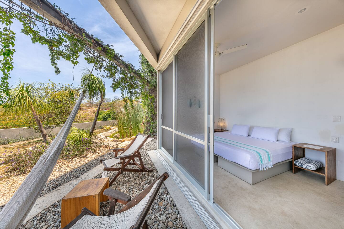 Escape to Casa Cascada, a design-forward stay perched above Playa Manzanillo in Puerto Escondido. Blending tropical serenity with modern industrial charm, our boutique home offers lush garden surroundings, panoramic ocean views, and a stunning infinity pool. Whether you're relaxing, exploring, or working remotely, this garden-level room offers the perfect mix of comfort, privacy, and local beauty. Daily breakfast included. 🍳